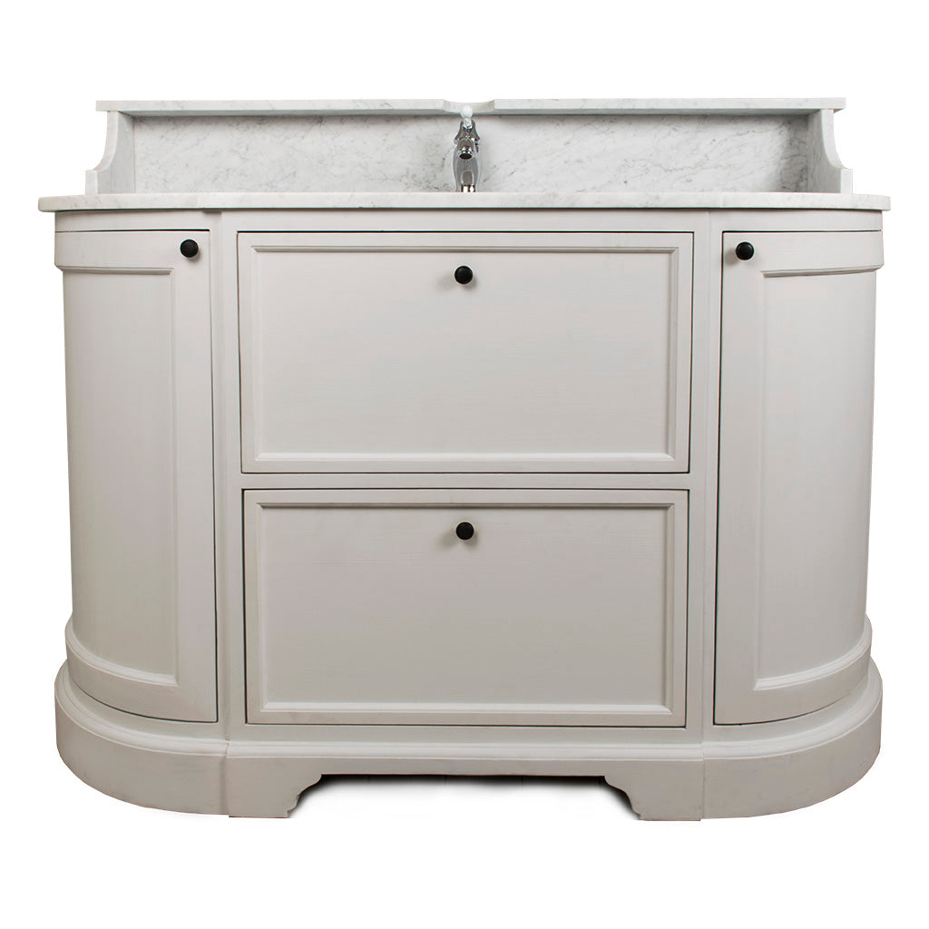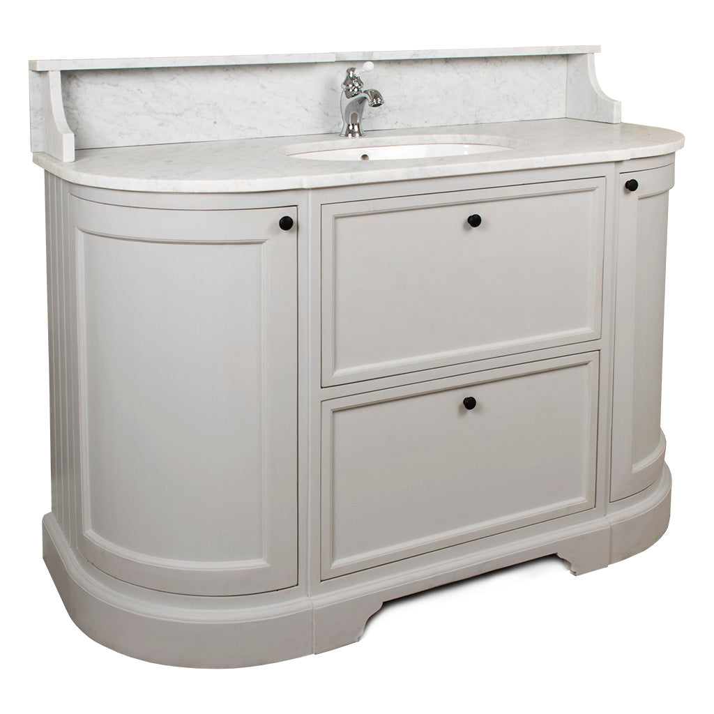 En klassisk badeværelseskommode med afrundede hjørner og buede skabslåger. Udstyret med en bordplade i Carraramarmor og en hvid porcelænsvask. Stellet er lavet af massivt træ og MDF, malet i farven stormy grey.
