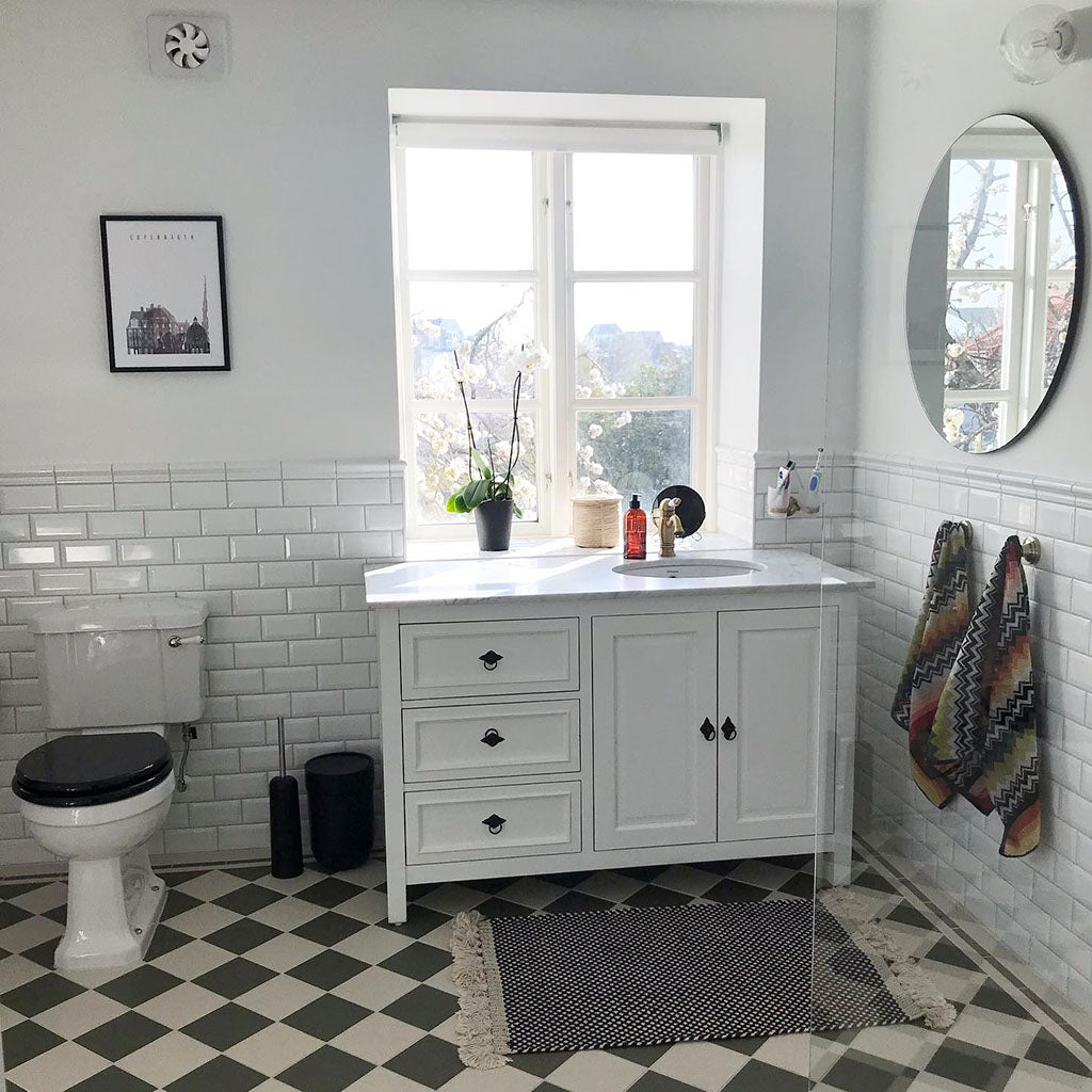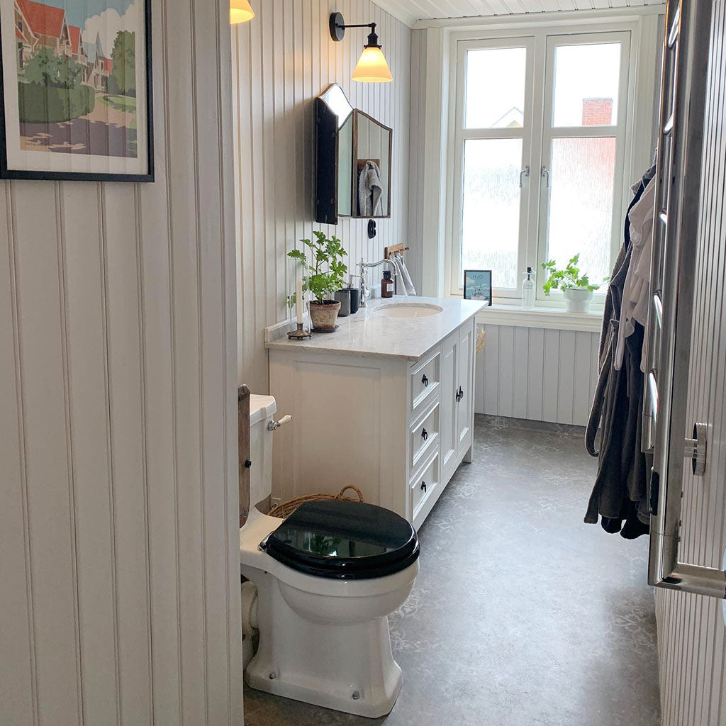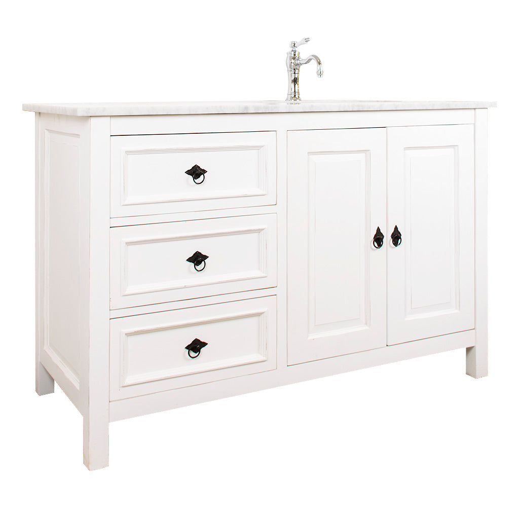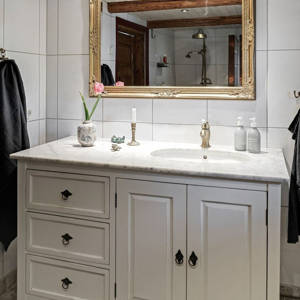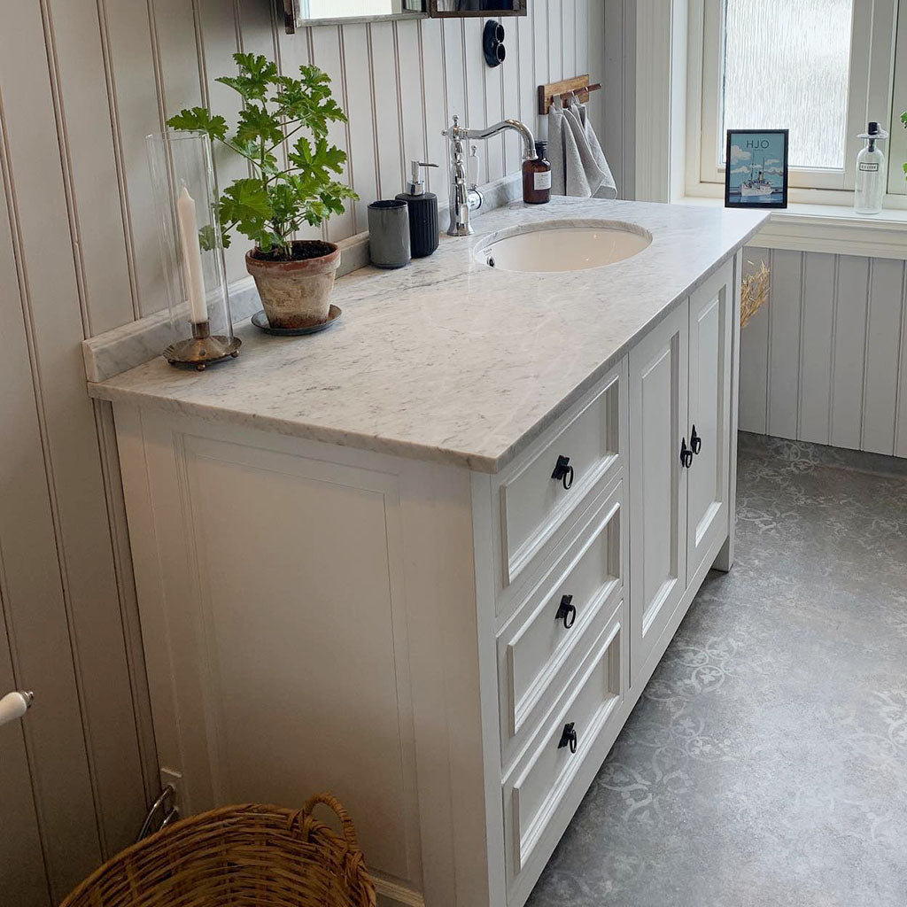 Kommode i klassisk stil, der passer til et gammeldags badeværelse eller et nyt badeværelse i traditionel stil. Kommoden Annie er inspireret af de kommoder i træ og marmor, der var almindelige i slutningen af 1800-tallet og begyndelsen af 1900-tallet og forudgik de moderne vasker. Kombinationen af skuffer og skabe giver god opbevaringsplads. Møblet er håndlavet i massiv mahogni og MDF, som penselmales for hånd i hvidt. Topplade i Carrara-marmor med undermonteret porcelænsvask. Porcelænsvasken er ikke monteret ved levering, men kan nemt monteres med de medfølgende beslag. Ved levering er der ingen udløbshul i kommoden. Dette gøres med eksempelvis en hulsave ved installationen.