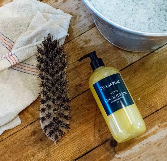 - Fyld en ti-liters spand med koldt eller lunkent vand og tilsæt 2-3 dl Qvesarums Linoljesæbe i spanden. Ved skuring af et ekstremt tørt trægulv anbefaler vi at fordoble mængden sæbe for at opnå et godt resultat.