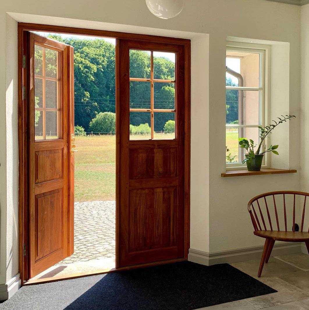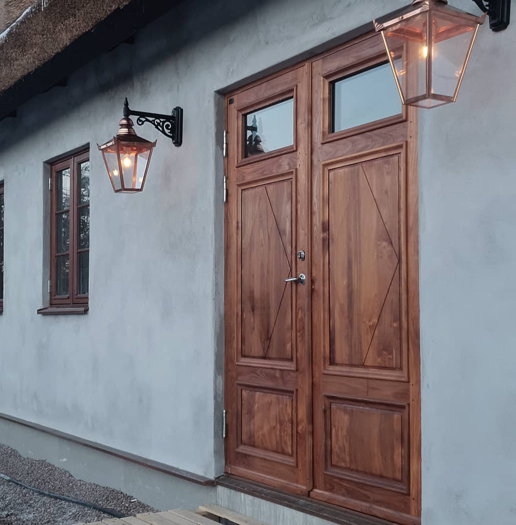 Brantevik pardörr i oljad teak. Modellen nytillverkas efter en gammal traditionell modell av pardörr från Österlen.