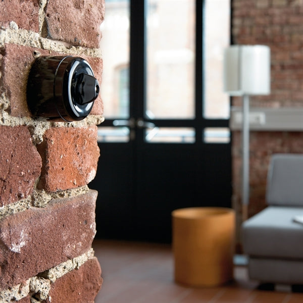 Kombiner den klassiske kuglestikdåse med en afbryder og vægdåse i sort bakelit.